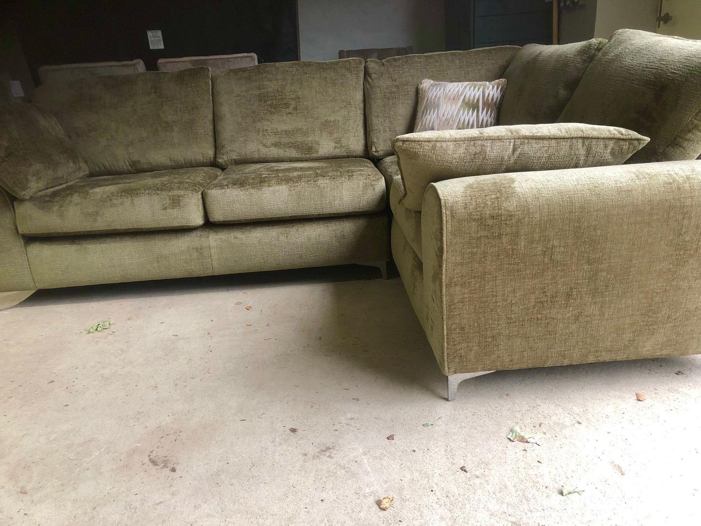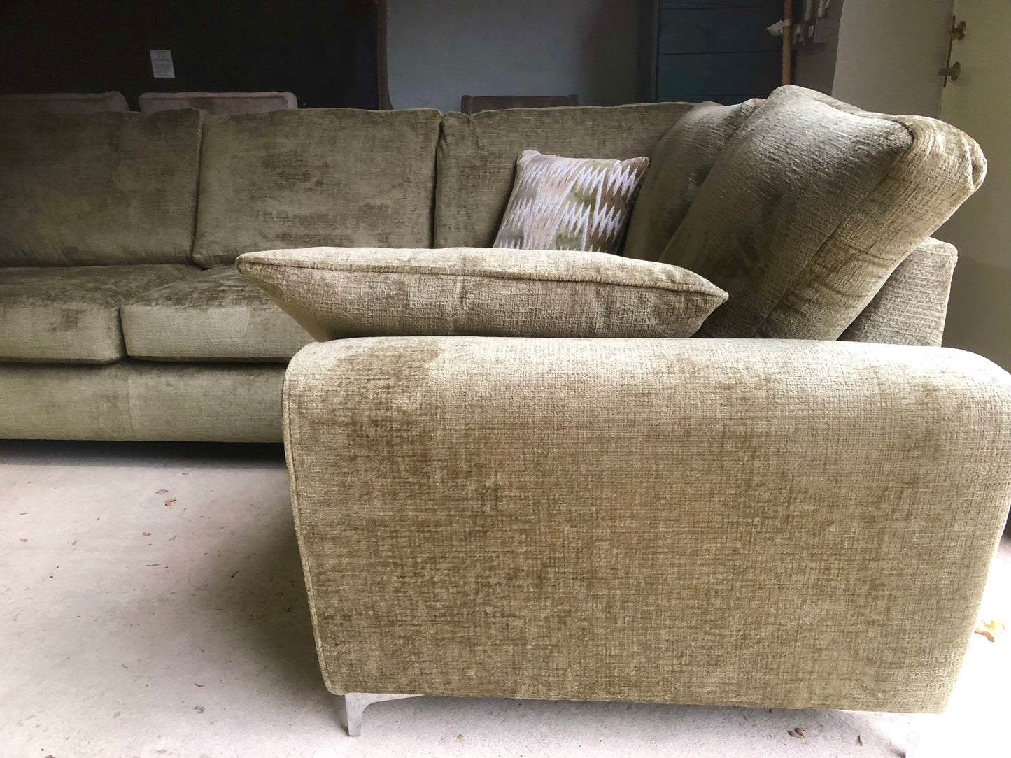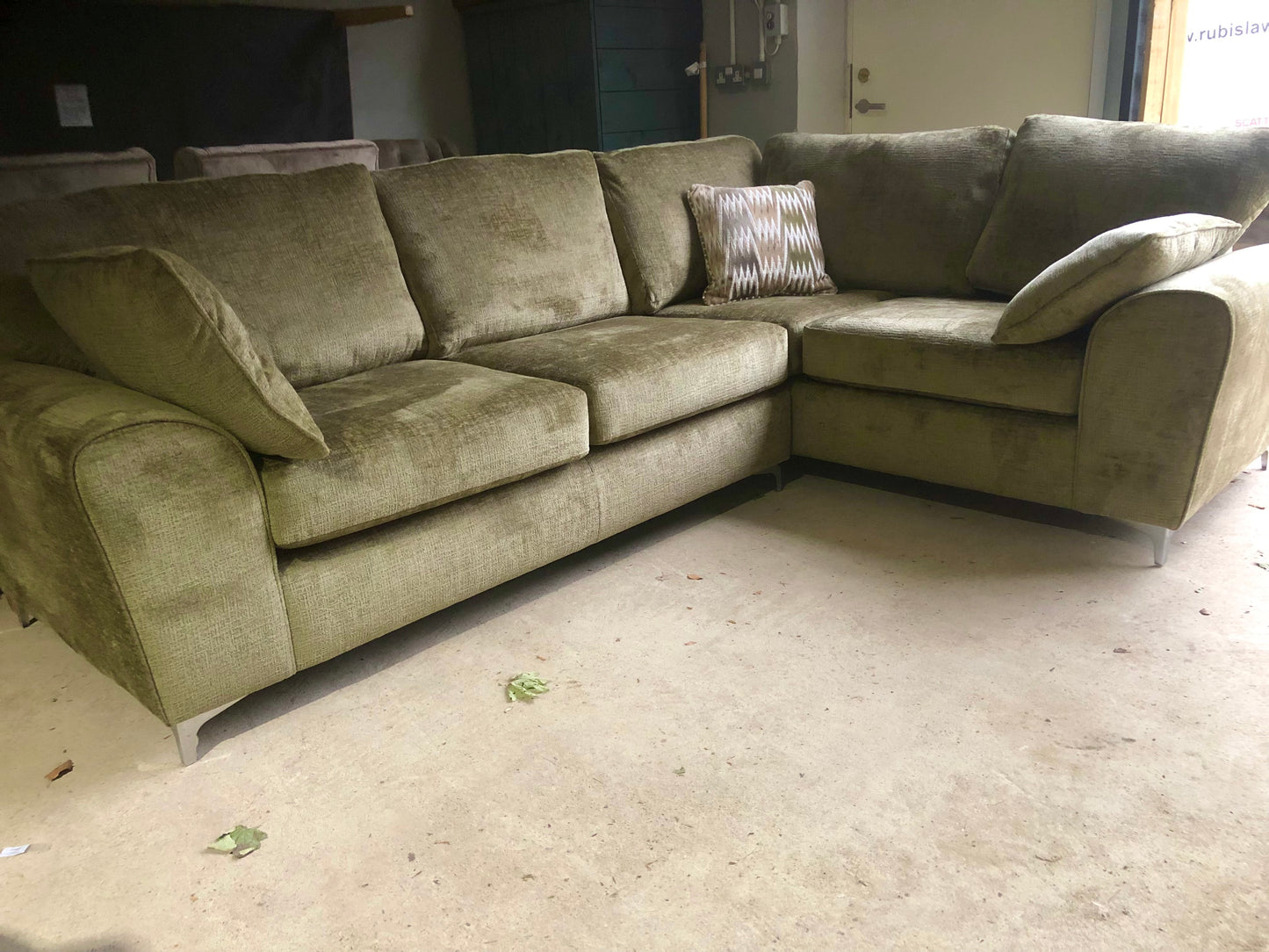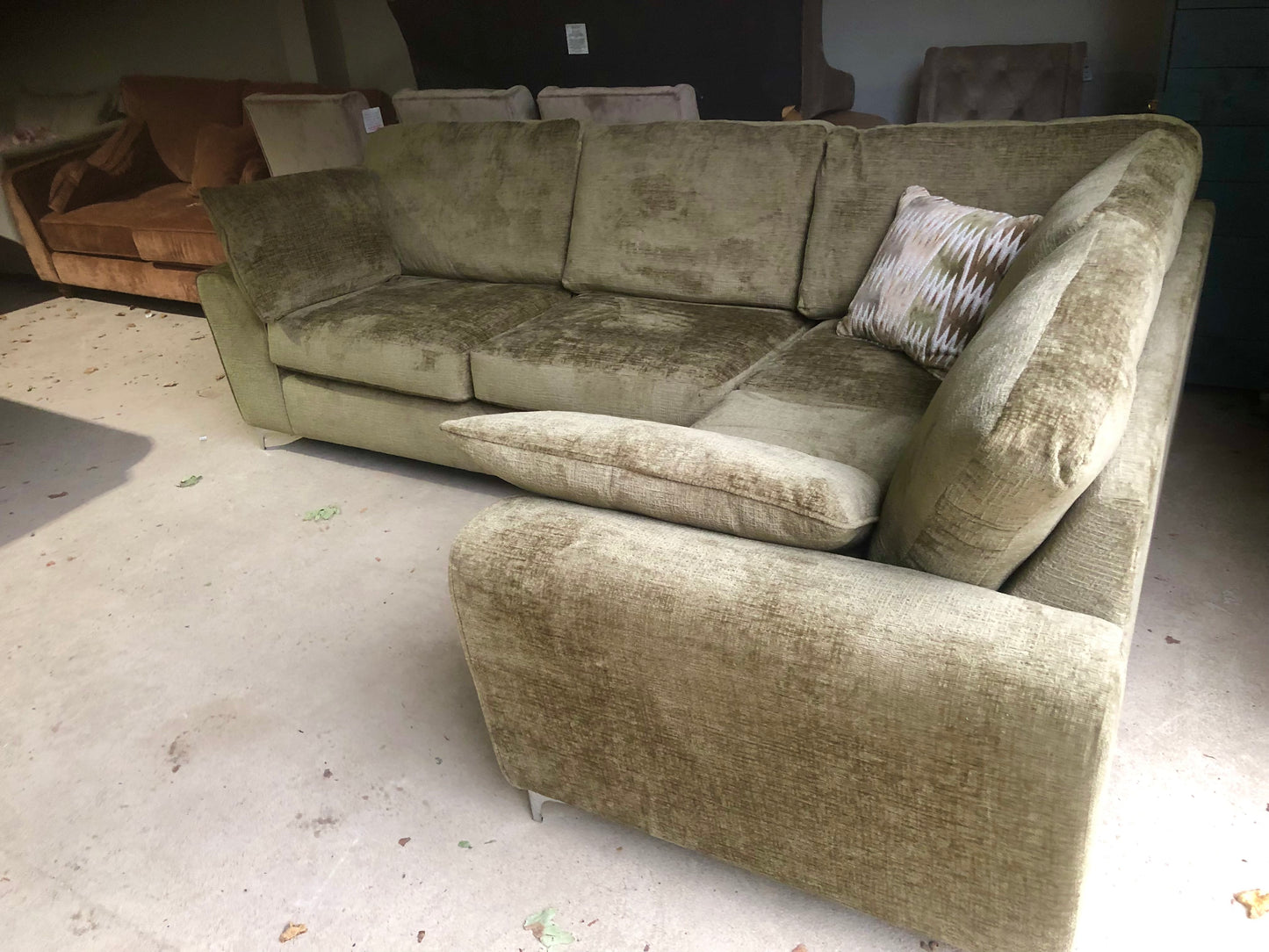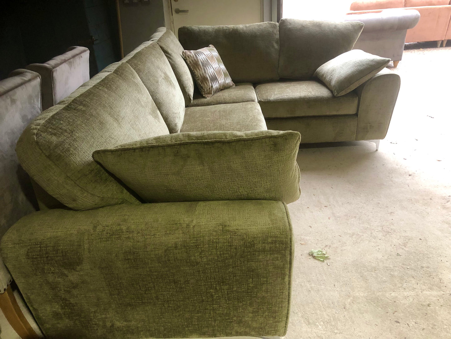 Gorgeous brand new large corner sofa in Moss Green Textured Velvet Fabric.