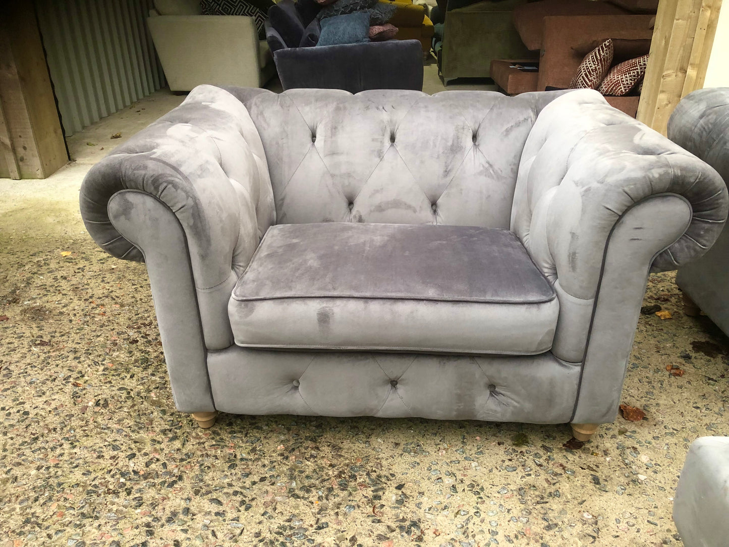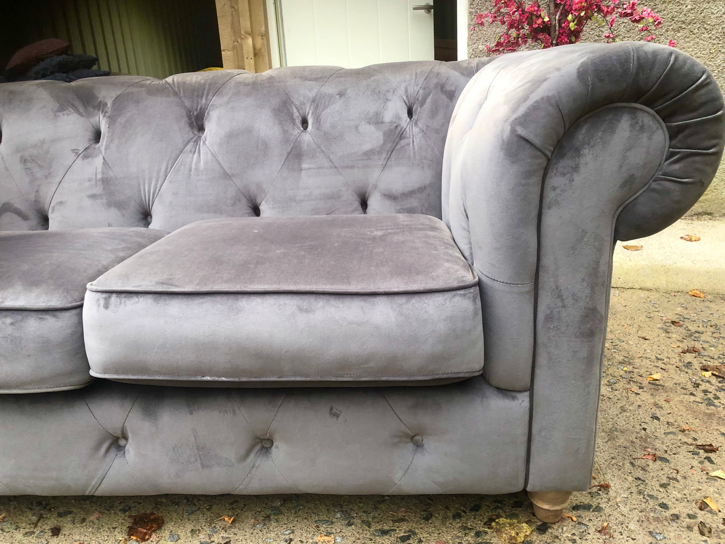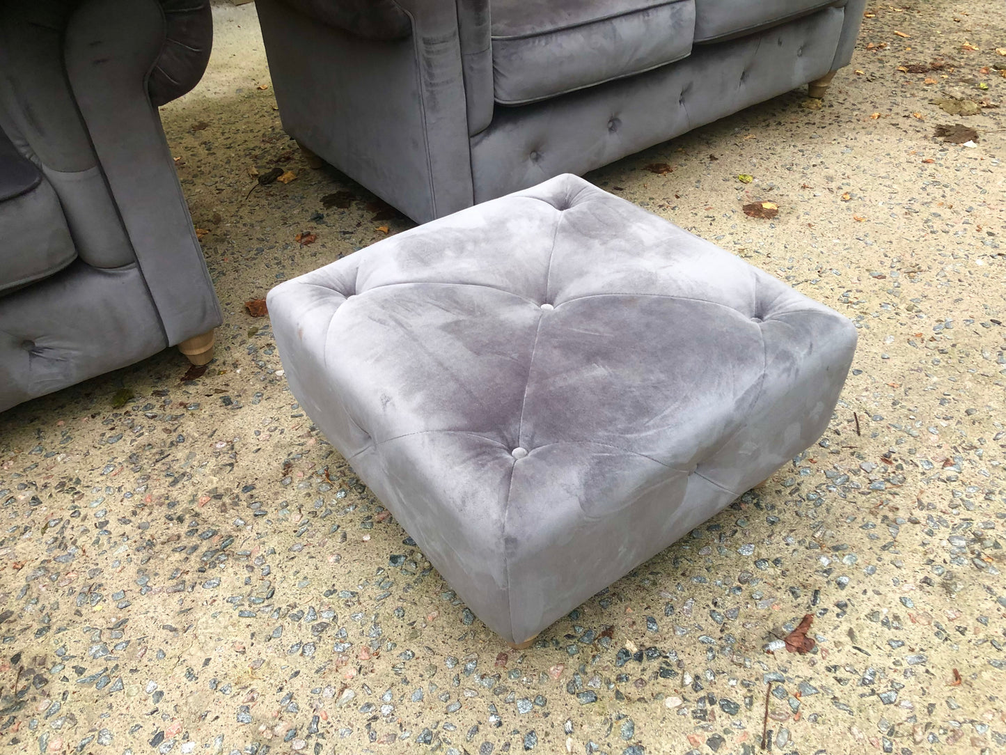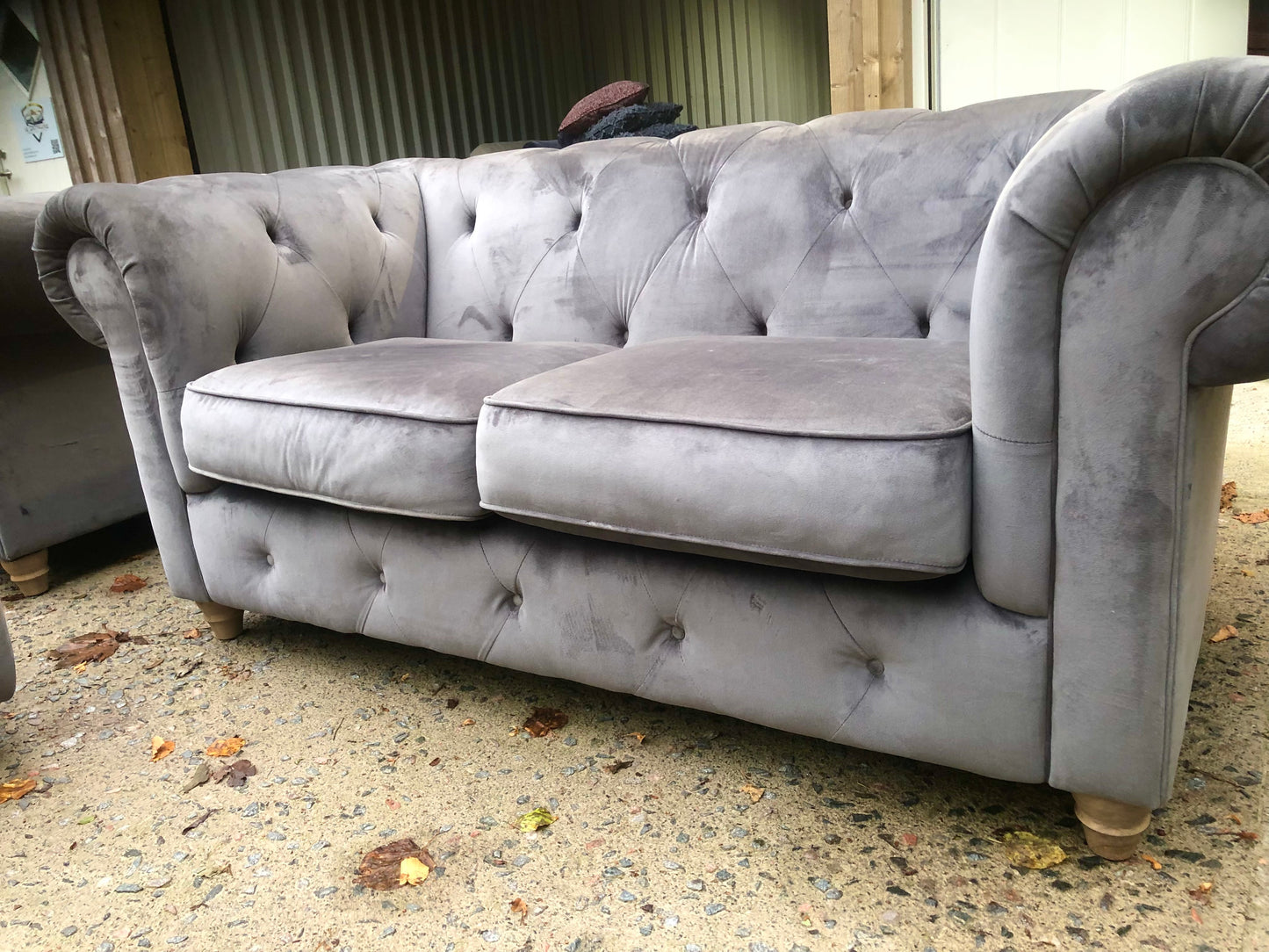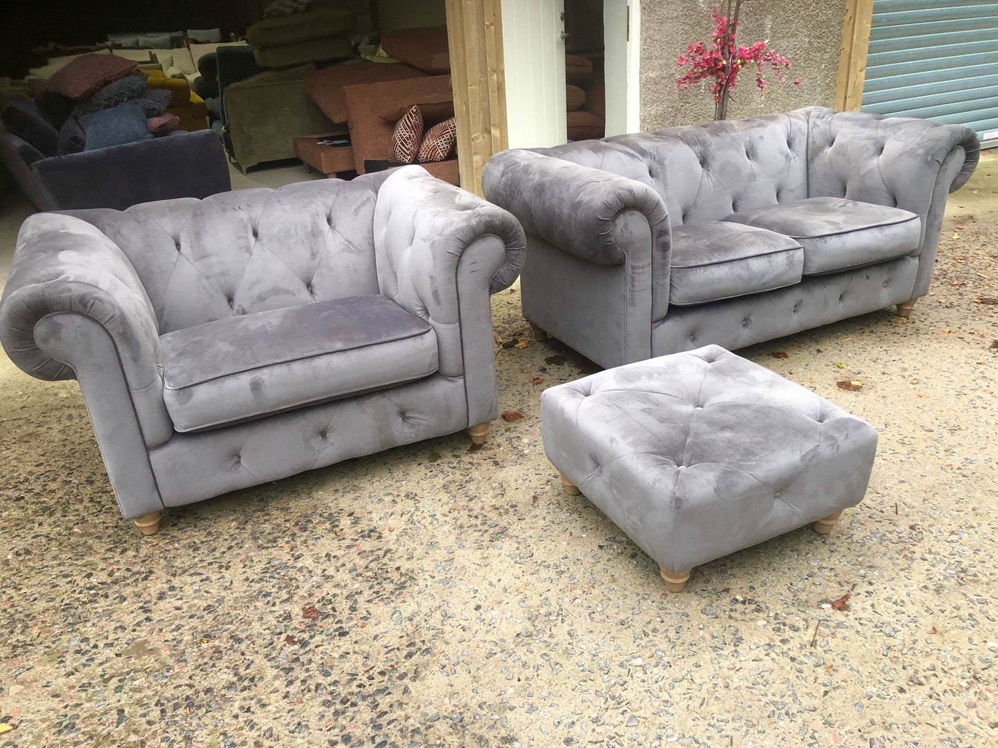 Gorgeous 2 seater, lovechair, and footstool in grey velvet.