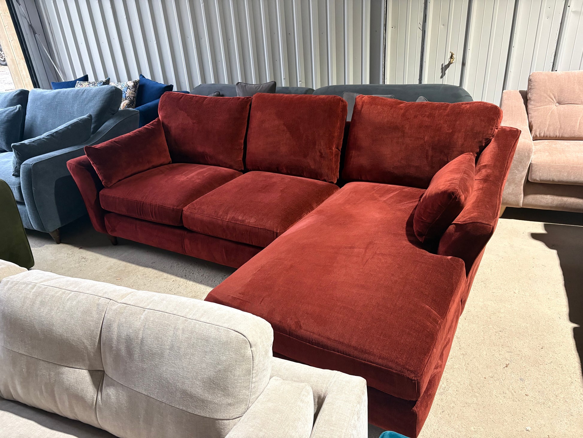 Gorgeous Ex Display corner sofa in a rich red velvet fabric.